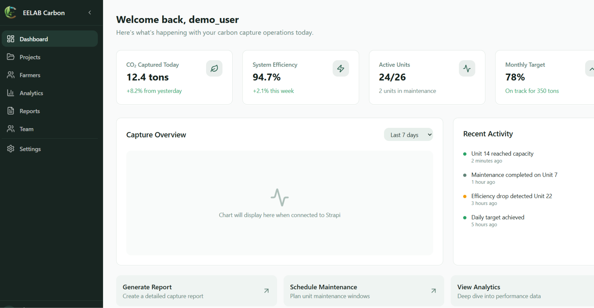 A dashboard for managing carbon capture projects with real-time data visualization and analytics.